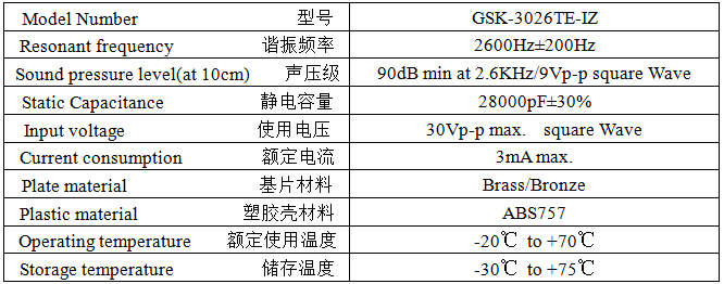 產(chǎn)品名稱: 壓電式無源蜂鳴器 30mm 2.6KHz插針