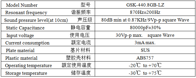 產(chǎn)品名稱: 壓電式無源蜂鳴器 44mm 870Hz插針